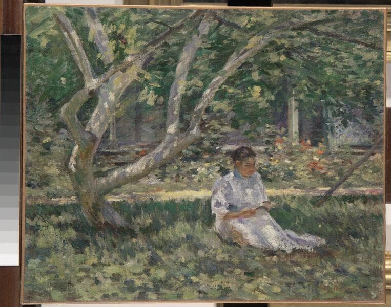 After meeting Claude Monet in 1888, Theodore Robinson began using the French Impressionist's methods: applying small brushstrokes of unmixed color to build the illusion of form. The bright "flowers" in the background are simply tiny spots of pure color, and dabs of white paint convey the sun's dappling the tree branches and the woman reading. Through his subtle use of greens, Robinson captured the effect of subdued sunlight. This intimate scene is most likely set near the seashore in Cos Cob, Connecticut, where Robinson spent the summer of 1894.
