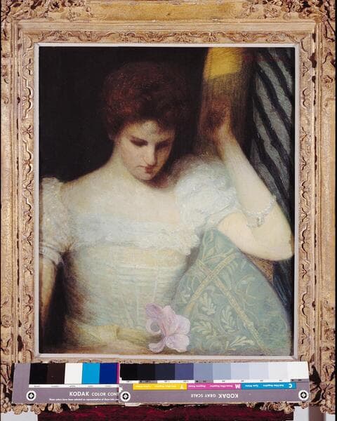 The Orchid combines Julian Alden Weir's interests in Impressionism and in 19th-century Japanese woodblock prints. The heavy, broken brushwork demonstrates the influence of Impressionism, while the asymmetry of the composition-with most of its visual weight on the right-and the closeness of the figure to the picture plane are devices common in Japanese prints. Rich and varied textiles, including the lace dress and patterned throw, provide an air of genteel refinement to the somewhat melancholy scene of a young woman gazing at an orchid.