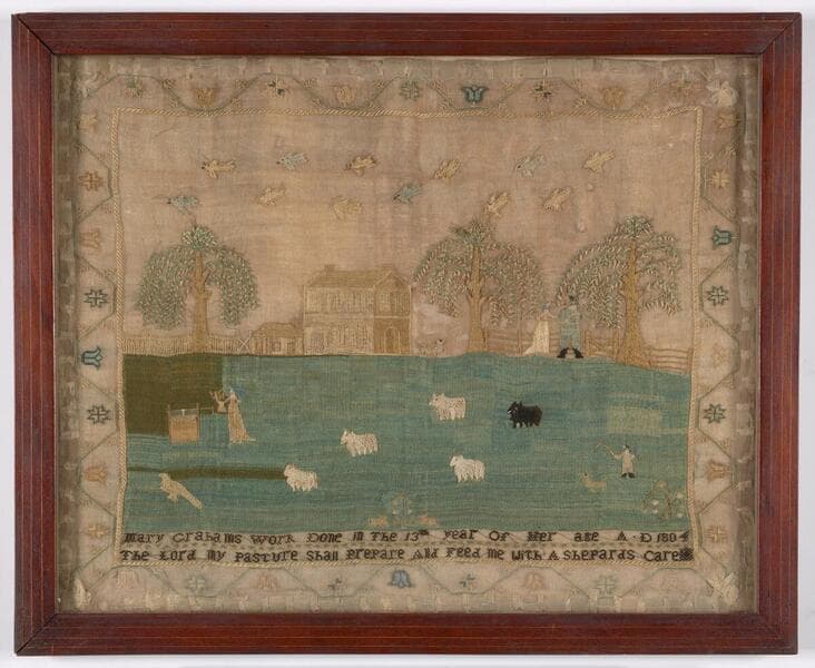 According to the inscription, Mary Graham stitched this sampler in 1804, when she was 13. This expansive pastoral landscape, opulated by sheep, dogs, rabbits, an eagle, and birds flying overhead, seems the perfect embodiment of the lines from Joseph Addison’s 1712 hymn: “The Lord my pasture shall prepare, and feed me with a shepherd’s care.” The asymmetrical placement of a house in a verdant landscape, delicately worked willow trees, rail-and-picket fence, and slender, high-waisted Empire-style clothing are characteristic of samplers produced in Philadelphia in the first decades of the 19th century. In her publication Girlhood Embroidery: American Samplers and Pictorial Needlework, 1650–1850, scholar Betty Ring refers to this landscape type as the “house and garden form” and notes that it first appeared in Philadelphia about 1798 and continued until 1834.