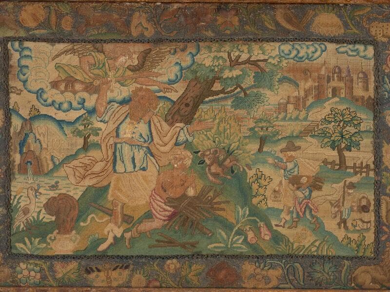 Throughout the 17th and 18th centuries, affluent young women in England and its American colonies studied the intricacies of fancy needlework. Their elaborately detailed compositions, often based on prints, frequently depicted Old Testament themes of piety and submission to the will of God. The subject of Abraham preparing to sacrifice his son Isaac upon God’s command (Genesis 22:9–13) was very popular in 17th-century needlework. This particular image of devotion is based on an engraving after Maarten de Vos’s Sacrifice of Isaac that was published by Gerard de Jode in Thesaurus sacrarum historiarum Veteris Testamenti (Treasury of sacred events from the Old Testament; 1585), a source for many needlework designs in the following century. The engraving and needlework composition depict the same narrative, with the angel staying Abraham’s hand, preventing him from slaying his son. However, the lake at the left of the composition, with its exotic flora and fauna, was added to the needlework version. Like the array of beasts, insects, and blossoms in the borders that surround the central panel, these additions symbolize the abundance of the natural world.