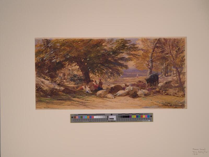 In this landscape, Palmer presents rural life through the lens of pastoral poetry, serene in mood and idyllic in setting. A group of children gather around a woman at the base of a tree, while sheep rest in the dappled sunlight nearby. Palmer varies his textures, paying attention to the dense leaves of the trees, the soft wool of the sheep, and the bristly fur of the calf. Made for an urban audience, such images of rural contentedness belie the reality of life in the English countryside during the nineteenth century. Industrialization was reducing the need for the traditional labor depicted here (2022).