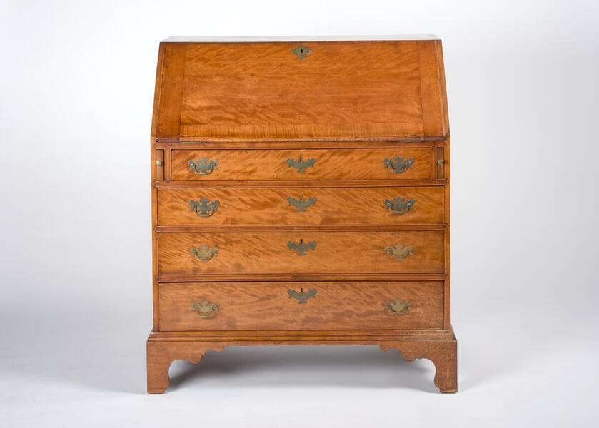 Introduced to America about 1720, the form of desk known today as a “fall-front” or “slant-lid” desk evolved from a combination of a chest of drawers and a portable writing box with a sloping lid. Containing numerous drawers of various sizes and cleverly concealed storage compartments, it was the 18th-century equivalent of a workstation and lockable safe. Typically, the hinged front lid dropped down to form a writing surface supported by horizontal lopers that slid out from either side. In the interior of this desk, the central prospect, decorated with an ornately carved shell, is flanked on either side by colonnettes that conceal storage compartments and a series of pigeonholes and drawers. Desks like this were used primarily by men conducting business affairs in the home. According to the documentation accompanying this piece, the desk was purchased in 1781 by Robert Endicott (1756–1819), whose ancestor John Endicott (1588–1665) was governor of the Massachusetts Bay Colony. The documentation—a note from Robert Endicott’s son William—states that it was purchased about the time his parents were married on November 1, 1781, and that they paid “nine hundred dollars (in Continental money)” for the brasses alone. The desk was passed down through generations of the Endicott family.