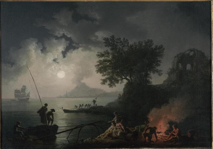 These paintings (2014.17.1 and 2014.17.2), created as a pair, play off of one another through balance and contrast. In "View of Naples," the juxtaposition of cool moonlight and warm fire allows the chilly sea to provoke a sense of distant wonder while the sheltered bonfire draws us to its intimate protection. In "Scene of a Shipwreck," the artist underscores the dramatic terror of the event by contrasting the blast of lightening from the angry storm with its pitiable victims.