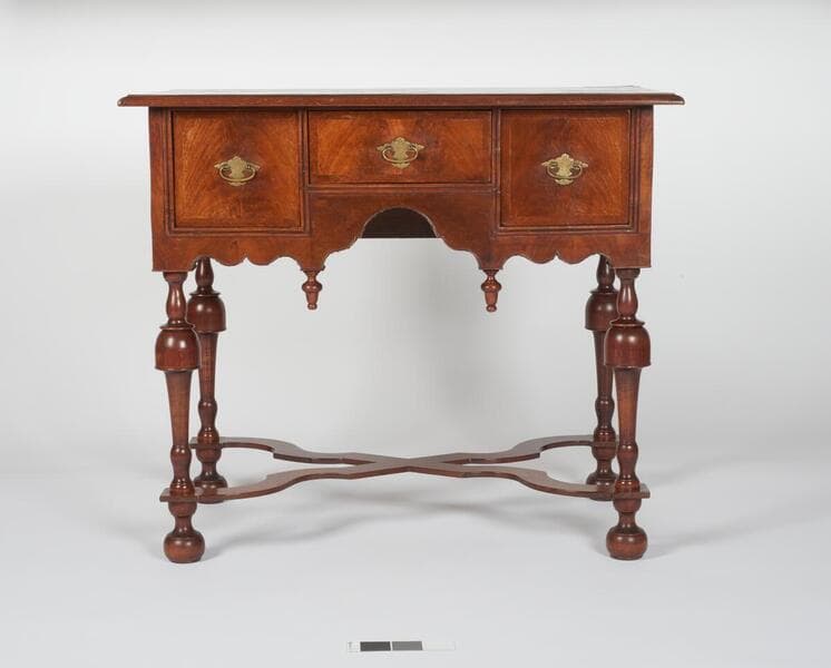 In the 18th century, dressing tables were used by women for applying makeup and dressing and were often paired with high chests of similar design. This dressing table with three side-by-side drawers reflects the formal and structural innovations of Baroque style, first introduced to America in the early 1700s. The walnut veneers decorating the table’s surface add visual richness to its overall composition. The attenuated legs—with their somewhat unsettling juxtapositions of diminutive vase-shaped turnings, inverted cups, and upturned trumpets—suggest a Baroque aesthetic that emphasized mystery, drama, and disquiet. The X-shaped stretcher and acorn-shaped drop finials are also typical of this style.