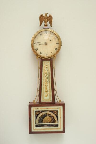 Known as a “banjo” clock because of its distinctive shape, wall-mounted time pieces such as this became immensely popular in this country in the first quarter of the 19th century.