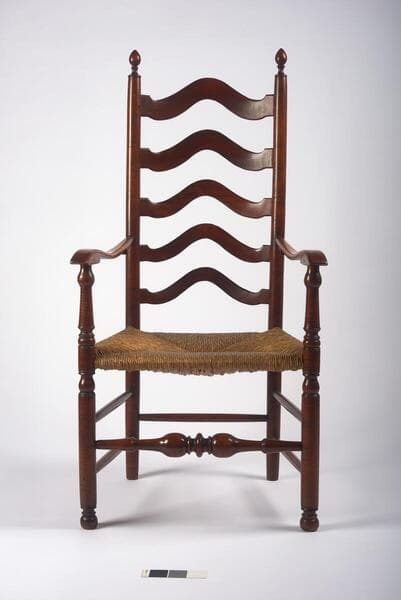 Tall, narrow, slat-back chairs were very popular in America in the second quarter of the 18th century. Often made in sets of six or eight and decorated in a variety of paint colors and finishes, they were produced in both rural and urban shops. Rush seats such as the one seen here could be ordered in a variety of weaves and in degrees of quality ranging from fine to superfine. Prices varied accordingly. This handsome chair has elegant, pointed, bulb-shaped finials, five graduated slats with a gracefully arched profile on both the top and bottom edges, and a double vase-and-ring stretcher. These features are typical of chairs produced in Pennsylvania, New Jersey, and throughout the Delaware
