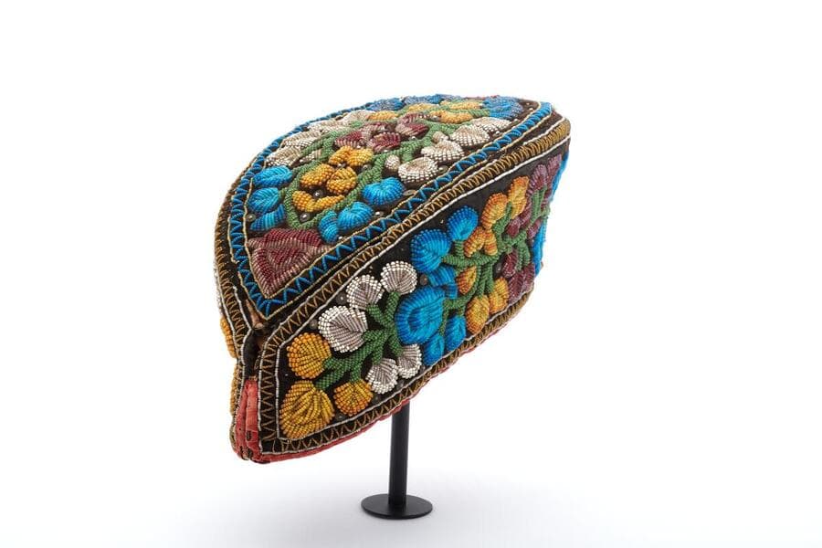 A product of the intersection of two cultures—First Nations and Victorian-era Euro-American—this "Glengarry cap" decorated with intricate floral beadwork was made by Haudenosaunee (Iroquois) women to be sold to tourists in region around Niagra Falls, on the border of the United States and Canada. The making and selling of such souvenirs—including beaded purses, gloves, wallets, and belts—was a means of economic survival and expression for local Indigenous peoples. The hat's popular style of beadwork was designed to appeal to Victorian tastes, and its Glengarry cap form was derived from Scottish Highland dress, made familiar by military uniforms worn by British soldiers in Canada.