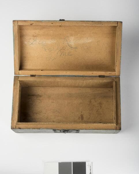 - Blue box with gray smoke decoration and green edging; with iron latch.