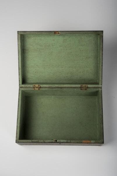 - Lock box with gold and orange stenciling on black background with leaf and flower motif, and the initials - L.L.E. on top, and a green interior and skeleton key lock; Connecticut or New York because of heavy stenciling commonly found in those areas, associated with Hitchcock chair company type of decoration.