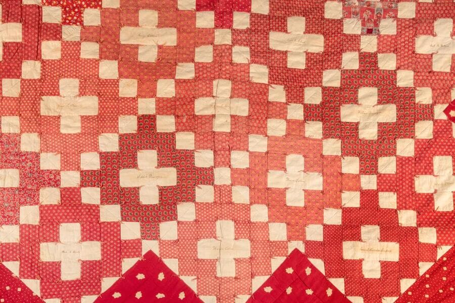 - Album Patch or Friendship quilt; squares forming white crosses, each contains a name written in script, surrounded by squares in red with small various small prints, and bordered by white blocks.