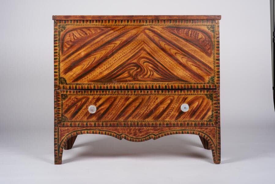 Vibrantly painted blanked chest; this chest represents the early nineteenth-century rural Vermont “high style.” The faux grain painting in red, green, brown and black resembles mahogany, satinwood, flame birch, tiger maple and bird’s eye maple veneers seen on fashionable federal furniture. This blanket chest stands on high cut out tapered feet with a carved skirt. The lower single drawer with thumbnail molding has glass pulls and the upper blanket chest has a lift top.