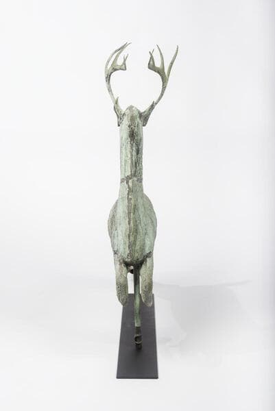 - Ten-point leaping stag weathervane, detailed boy, with verdigris patina.