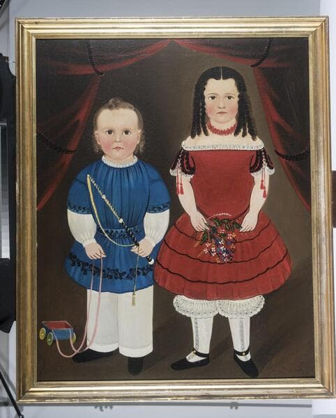 This boldly executed portrait of two well-dressed children from a prosperous Massachusetts family presents them in typical mid-19th-century sartorial fashion: the girl in a flounced dress with wide off-the-shoulder neckline and distinctive tasseled sleeves and short leglets tied at the knees, the boy in a belted embroidered tunic and trousers. Sturtevant Hamblin came from a family of artisans that included his grandfather, father, and three brothers. Most of them advertised as house, sign, and fancy painters, and Sturtevant, who considered himself a portrait painter, probably earned part of his living in this manner. Originally from Portland, Maine, the Hamblins moved to Boston in 1840.