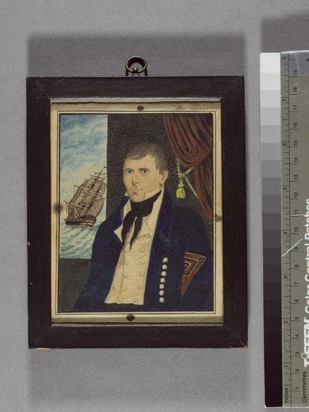 - A pair of miniature portraits in strong color and brilliant detail. The Captain is seated on a paint decorated chair; the drawn curtain reveals a view of a tall masted ship. His double buttoned shirt is topped with a fringed black cravat.