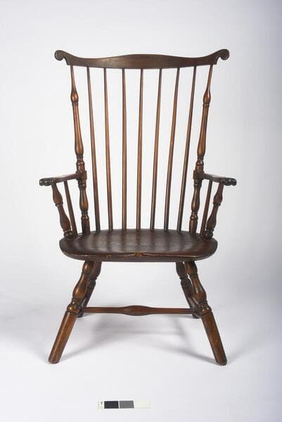 The Windsor chair, among the most popular forms of seating furniture in America in the late 18th century, appeared in both affluent and middleclass homes. Though the origins of the term are uncertain, the name “Windsor chair” first appeared in inventories in England in the 1720s and in America around 1740. Simply constructed and highly practical, this type of chair has a flat plank seat, usually made of pine; turned legs, stretchers, and back posts or “stiles”; and long spindles typically made of oak, hickory, or ash. The various members are fitted into holes bored into the plank to form the back and support the seat. This “fan-back” armchair, named for its high, outward-flaring back support, is unusual because of the elaborate turnings in its back posts, both above and below the arms; the elegant carving of “ears” at either end of the serpentine crest rail; the knuckle handholds at the end of each arm; and the rectangular block where the arms join the back posts. These features are typically associated with chairs made in coastal New England, particularly Nantucket.