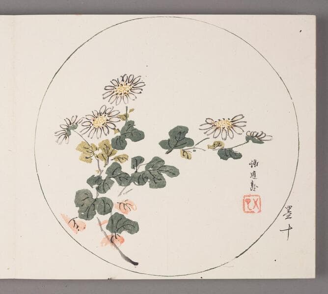 Besides being admired for their beauty, chrysanthemums were also prized as foods and medicines. The white chrysanthemum shown here has long been used to infuse teas and spirits. The image is paired with a poem filled with references to earlier writings about the flower. These pages are part of one of the first multicolor books published in China.