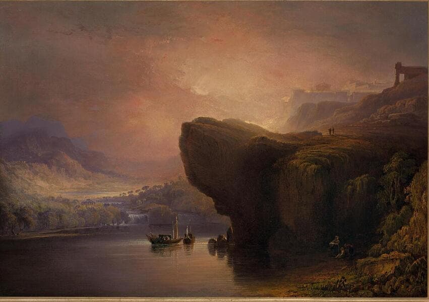 The City of God exhibits many of the hallmarks of Martin’s iconic artistic style: dramatic depiction of deep space, atmosphere suffused with otherworldly light, and the outsized relationship of landscape forms to human figures. His visual representation of the Christian heaven appears as a gleaming city beyond the setting’s verdant valley and placid waters.