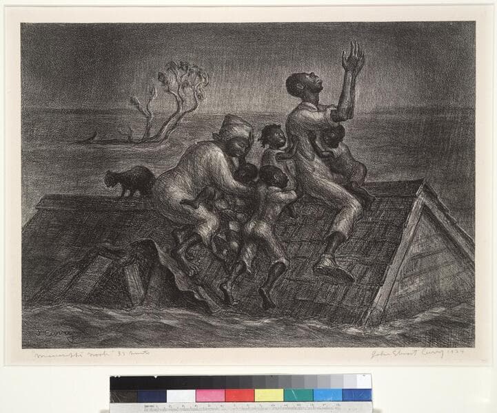 The title suggests that the father's prayers for his family to be delivered to dry land will be answered. Curry's direct inspiration for the subject was the flooding of the Kaw River in Kansas in 1932, but he decided to set the scene along the Mississippi River, which experienced devastating floods in 1927. The Mississippi flood of 1927 hit African-American communities particularly hard and factored in the large migration of blacks from the South to northern cities in the 1920s and 1930s.