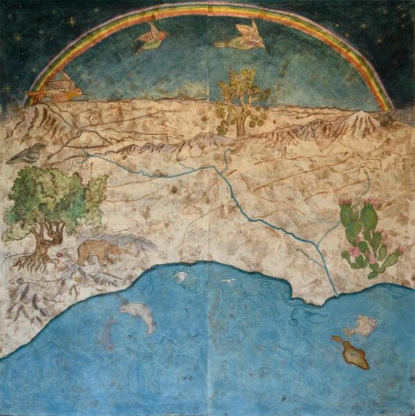 YOU ARE HERE, a map of Los Angeles, uses an evocative representation of topography, language, and land use over time to make visible the movement and histories of the peoples who have long called this place home. Native plants, animals, and a sacred oak as cosmic tree orienting the cardinal directions intermingle with references to uprisings amid past epidemics in Los Angeles, under a rainbow presenting a view of our past, present, and hope for the future. Viewers are invited to pause and locate places and personal histories within this monumental, multilingual map of our city.