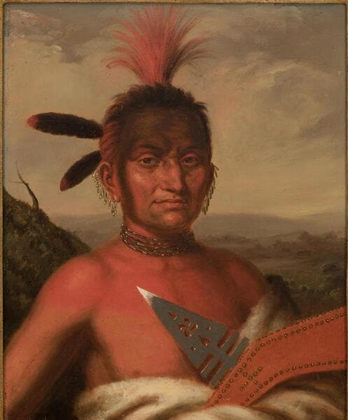 In this striking portrait of Moanahonga (Great Walker), Charles Bird King carefully renders markers of the sitter's leadership and power—his extraordinary gunstock war club with pierced decoration on the iron blade, his tufted deerskin headdress (called a roach), red-tipped feathers, silver and shell jewelry, and his body paint in red and black, all of which refer to his tribal status and skill as a warrior. Commissioned by the U.S. government, King produced over a hundred such portraits of Native American leaders who had come to Washington, D.C., during the 1820s and 1840s to negotiate treaty settlements. The visit in 1824 by Moanahonga and seventeen Ioway (Iowa) leaders resulted in the dispossession of their land in the northern half of Missouri and the group's removal westward to what is now the Kansas-Nebraska border.