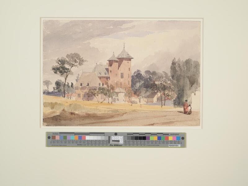 This fluidly painted watercolor presents a country estate sitting amid a protective clump of trees as the afternoon sun casts angled shadows beneath the sloping rooftops. These repeated triangles, also seen in the shadows of the building and among the outlying structures, reveal the artist’s interest in shape and pattern. The measured rhythm they create is enlivened by the delicate brush-point details of the grass and the spontaneity of the figures, formed with only a simple stroke or two to suggest both shape and volume. In addition to the loose brushwork, Boys has pressed his own fingers into the pigment to create texture, as seen in the branches of the gangly tree at left (2022).
