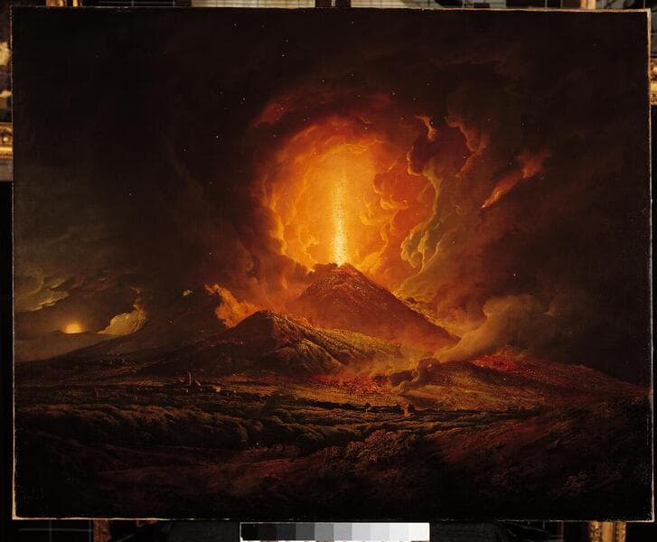 Fascinated with the destructive power and awesome beauty of Mt. Vesuvius, Joseph Wright sketched the erupting volcano during a visit to Naples in 1774. This painting, however, goes beyond simple documentation. Drawing upon the sublime, an aesthetic concept in which the thrill of danger enhances the experience of pleasure, Wright magnifies the volcano's terrifying mass against the minuscule buildings below. The blast of light created by the eruption is intensified through comparison with the pale glow of the moon, rising through the smoke and clouds at left.