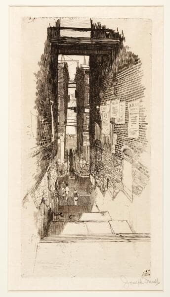 Water Street Stairs offers an unusual perspective onto the narrow corridors created by Lower Manhattan's dense architecture and a view to the water that reveals the riggings of ships in the harbor. This print was made toward the end of Pennell's career, at which point he was renowned as a leader and advocate of printmaking in the United States.