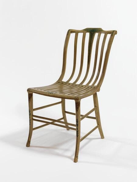 The back and seat of the chair are made of continuous slats of wood bent into curves with the aid of steam and clamps. The peacock feather decoration painted on the central splat, which fans out on to the chair's crest rail, and the floral decoration on the legs, which terminate in goat-hoof feet, are further evidence of Neoclassicism in Samuel Gragg's innovated design.