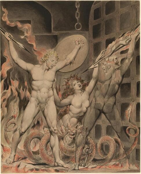 The strong diagonals formed by the combatants' weapons give linear expression to their conflict and focus attention on Sin, who rises to separate them. She is pictured with a voluptuous torso, but below her loins are the tails of two serpents coiling "in many a scaly fold/Voluminous and vast" and the heads of three "Hell Hounds…/With wide Cereberean mouths" (2:650-51, 654-55). Her "fatal Key" to "Hell Gate" (2:725) dangles to the right of Death's right calf. Above and behind Satan are two archways, suggesting that he has already passed through two groups of the "thrice threefold" gates and has come to the last set "of Adamantine Rock" (2:645-46). Although the rectilinear gateway on which the figures stand suggest rock, the barrier on the right is, as in Hogarth's painting, a "huge Portcullis…/Of massy Iron" (2:874, 878) with vertical bars terminating at the bottom in points like Death's dart. The chain descending above the center of Blake's illustration also recalls the chain hanging from the portcullis in Hogarth's picture, as well as the chains in Blake's first design.