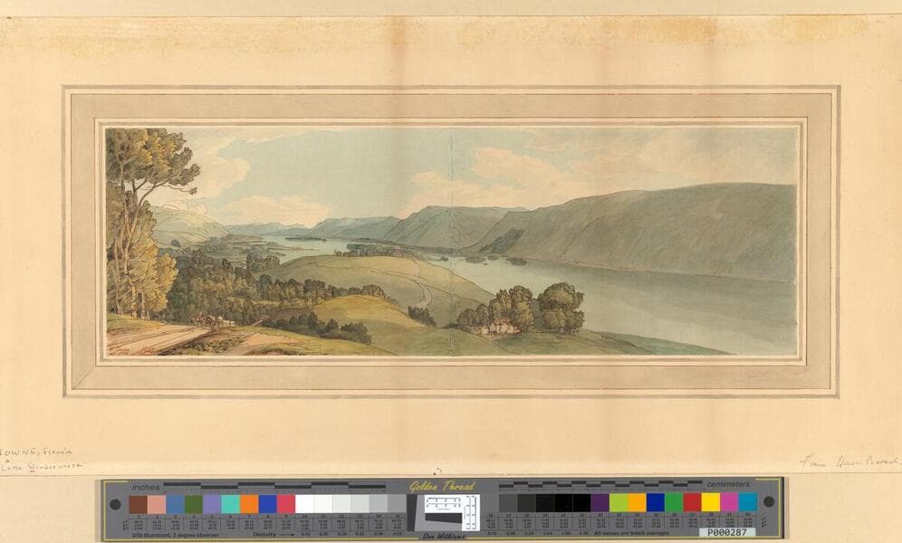 In the summer of 1786, Towne spent a number of weeks in the Lake District of northern England, filling two large sketchbooks and a portfolio with drawings. This view of Lake Windermere was made, as the artist’s inscription notes, on August 16 around 4:00 p.m. Though he drew the pencil outlines on the spot, Towne typically dismantled his sketchbooks at the end of a journey, joining the pages together and coloring them with watercolor. He altered the right third of this drawing later, as shown by the discontinuation of the pen lines along the top ridge of the mountain and at the lakeshore below (2022).