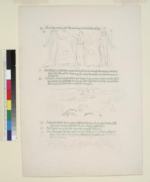The design between verses 21 and 22 shows two billowing waves with a bottlenose dolphin (illustrating "whales," 1:21?) sporting between them. Above are three winged figures, their heads and bodies close together in a recessional diagonal from left to right. The front-most head looks like Christ's on leaf 1, and thus once again Blake would seem to be picturing the Trinity. They soar above the waves like "the Spirit of God" who "moved upon the face of the waters" (1:2). Just above the water are a few pencil lines, perhaps clouds, on the left; and on the right, a very sketchy outline of a "winged fowl" (1:21).