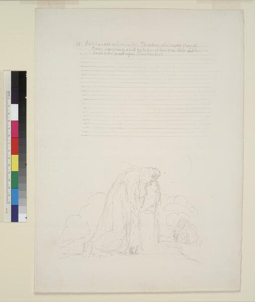 - Text of Genesis 4:15 and 20 with ruled lines drawn in anticipation of further text. The design at the bottom of the leaf directly illustrates the single verse written above it ("And the Lord set a mark upon Cain"), but in such a way to visualize Blake's interpretation of the event set forth in the second line of his chapter heading on leaf 10 ("& of the Forgiveness of Sins written upon the Murderers Forhead"). God the Father, on the left, kneels to embrace the much smaller figure of Cain and to kiss his forehead in an act of tender forgiving and blessing more than marking. Cain turns his face up toward God and touches His right upper arm with his left hand. The composition follows the conventions used in many illustrations of the return of the prodigal son in Christ's parable (Luke 15:11-32), such as the engraving by Marten de Vos (1531-1603) and Rembrandt's famous etching of 1636. Through this visual allusion, Blake establishes a typological relationship between the marking of Cain and the forgiving of another wayward son, itself a foreshadowing of Jesus on the cross forgiving His murderers (Luke 23:34). A cottage with steeply-pitched roof stands in the background on the right. Two bending, perhaps kneeling, forms in front of the dwelling are probably Adam and Eve. Curving lines outline clouds on each side of God and Cain. The most significant alteration of the King James version is Blake's addition of "Adamah," the Hebrew word for "ground" in the English text, to indicate that Adam was made "of the dust of the ground" (2:7) and named accordingly. Blake uses the Hebrew word in only one other place in his writings, the "Laocoon" inscriptions of ca. 1820, where he explains that God repented that "he had made Adam (of the Female, the Adamah)." [1] Blake thereby suggests that the man created in Genesis 2:7 was originally a synthesis of masculine spirit and female matter, an internal dualism externalized in the creation of Eve. To underscore the nature of such a man, Blake also substitutes (albeit no consistently), "Adam" for "man." It may be significant that he makes no such changes in the "Elohim" creation myth of chapter 1 (see comments on leaf 7). However, Blake complicates the Elohim/Jahweh distinction by adding "Elohim" (a plural) after "Gods" in Genesis 3:5, apparently to contrast the creator of the material world with "Jehovah," his substitute for "Lord" in Genesis 4:1. [2] Blake introduced another group of revisions to eliminate a possible inconsistency in the King James text. In 2:8, Adam and Eve are located in "a garden eastward of Eden," but by 2:15 this becomes "the garden of Eden." Blake does not emend 2:8, but deletes "Eden" from 2:15. The change of "from the garden of Eden" to "at the garden of Eden" in 3:23 may have been made for a similar reason since "at" does not require the prior presence within necessitated by "from." In 4:15, leaf 10 and illustration of God marking Cain and forgiving him, leaf 11. Even the change of "his" to "its" in 1:11-12, and the deletion of "his kind" in 1:12, would appear to have been made for the sake of consistency with "itself" in the same verses. Similarly, Blake converts to the genderless pronoun in reference to "seed" at the end of 3:15 to be consistent with "it" earlier in the same sentence. Other revisions may be simple errors, but it is possible that even the most trivial changes are Blake's response to the Hebrew text. [3] Notes 1. Blake 1982, 273 (based on Genesis 6:6). Blake's association of "Adamah" with the feminine is probably based on the gender of the "ah" ending in Hebrew. For Blake's use of Hebrew in his own texts, see Arnold Cheskn, "The Echoing Greenhorn: Blake as Hebraist," Blake: An Illustrated Quarterly 12 (1978-79): 178-83. 2. In 1810, Blake told Henry Crabb Robinson that the creator of the material world "was not Jehovah, but the Elohim" (Robinson's Remiscences, Bentley 1969, 545). Jehovah, as the bearer of a "Covenant of the Forgiveness of Sins," is contrasted with the vengeance-seeking Elohim at the end of The Ghost of Abel (Blake 1982, 272). See also H. Summerfield, "Blake and the Names Divine," Blake: An Illustrated Quarterly 15 (1981):14-22. 3. This possibility was brought to my attention by Robert R. Wark's introduction to an unpublished facsimile of Blake's Genesis manuscript. I am grateful to Dr. Wark for allowing me to read his typescript.