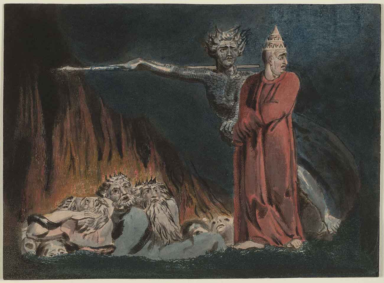 William Blake (British, 1757‒1824), Lucifer and the Pope in Hell, ca. 1794‒96, etching and/or engraving, color printed with gum or glue-based pigments, and hand finished with watercolor, pen, and ink. The Huntington Library, Art Collections, and Botanical Gardens.